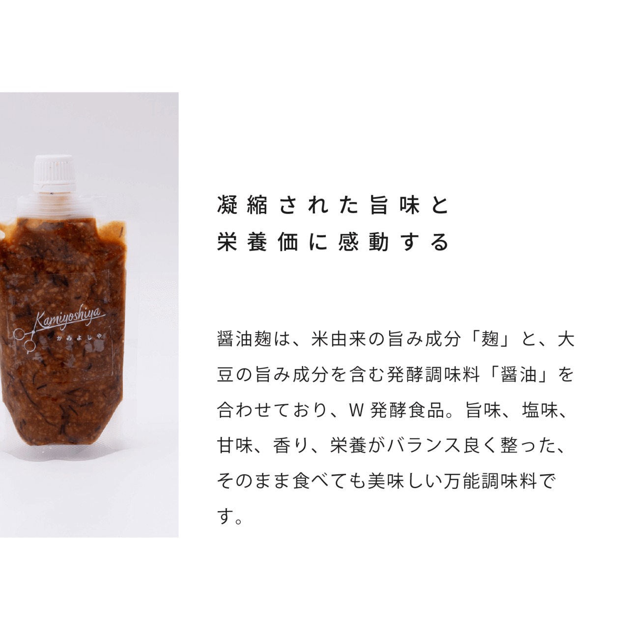 醤油麹は、米由来の旨み成分「麹」と、大豆の旨味み成分を含む発酵調味料「醤油」を合わせたW発酵食品です。旨味、塩味、甘味、香り、栄養がバランス良く整った、そのまま食べても美味しい万能調味料です。